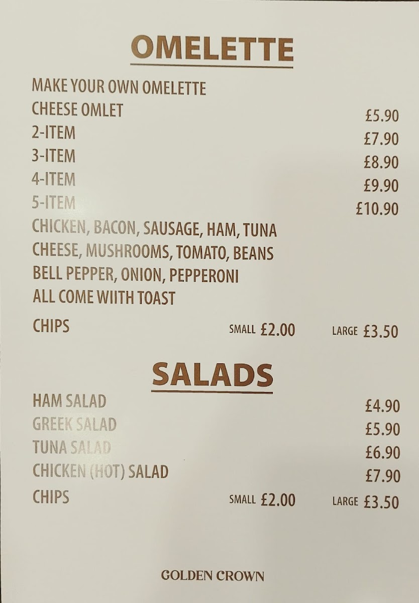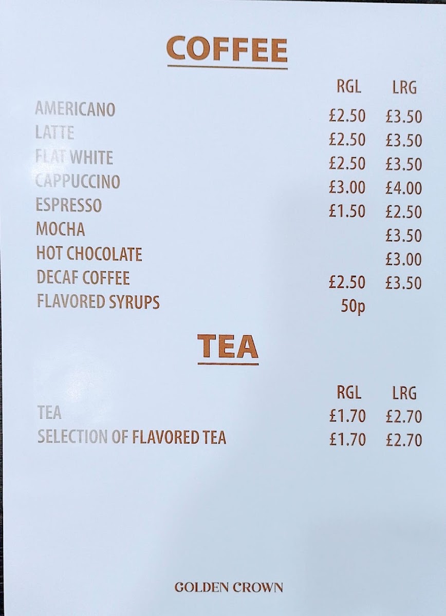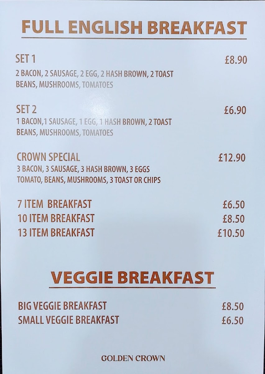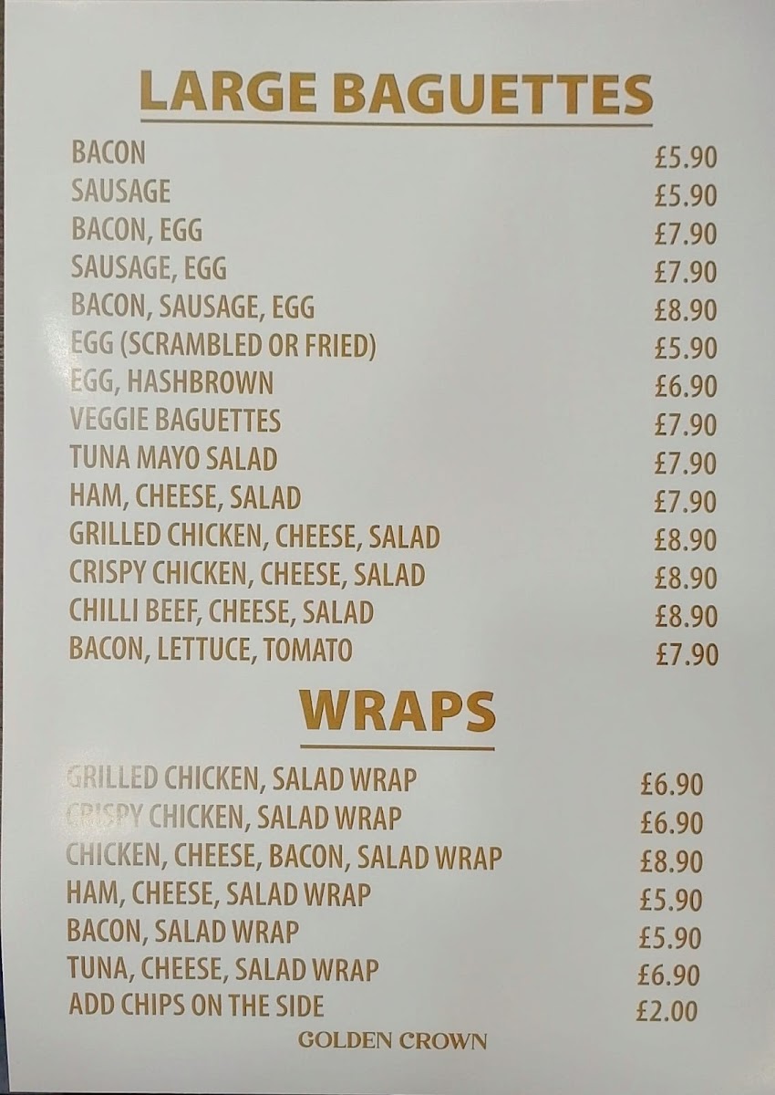 Golden Crown Café offers a tempting variety of dishes that cater to all tastes. Start your day with their famous Full English Breakfast, where options like the Crown Special and the generous portions of the 10 Item Breakfast leave customers raving about the quality and quantity. If you're in the mood for something lighter, their scrumptious Large Baguettes or Wraps made with fresh ingredients like crispy chicken, tuna mayo, and bacon are sure to satisfy your cravings. With prices ranging from just £5.90 to £12.90, you’ll find exceptional value that doesn't compromise on taste.